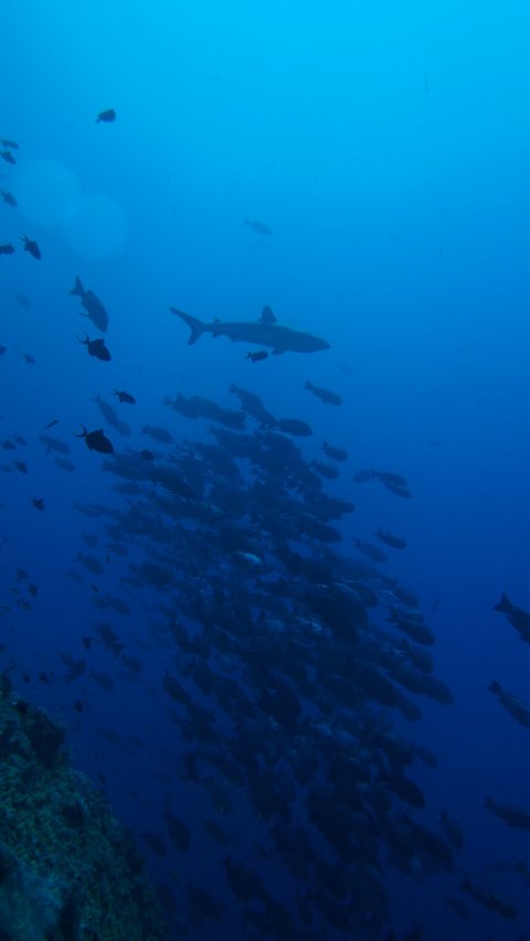 물고기들 스쿨링 위에 상어한마리 실루엣!