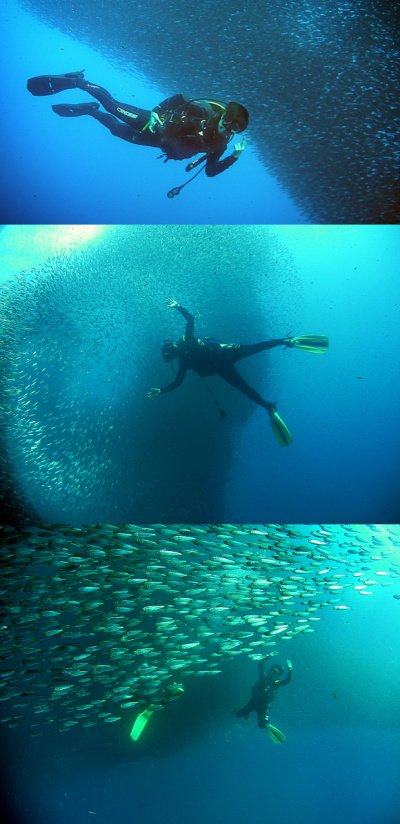 저기, 제 머리위를 가리고 있는 검은점들이 뭐냐면... 정어리 입니다. 태양을 가리는 정어리때 입니다.