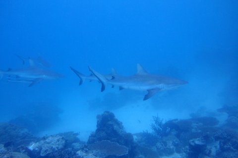 이 녀석들은 그레이리프 상어입니다. 스포츠카처럼 미끈하게 잘 빠진 이 녀석들이 단체로 먹이활동하는 모습은 다이버들의 넉을 빠지게 합니다.^^