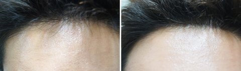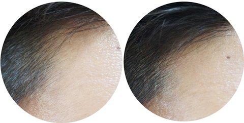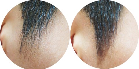 사진에서 보여드리는 것처럼 이마 헤어라인과 구렛나루 부분을 브러쉬를 이용하여 어두운 색상에 섀도우나 브론징 파우더로 빈곳을 채워 나가 주시면 됩니다. 생각보다 쉽고 티도 많이 안나기 때문에 초보자 분들도 쉽게 따라 할 수 있을거에요.
