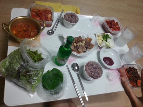 후라이팬에 고기 궈서 쌈싸머겅