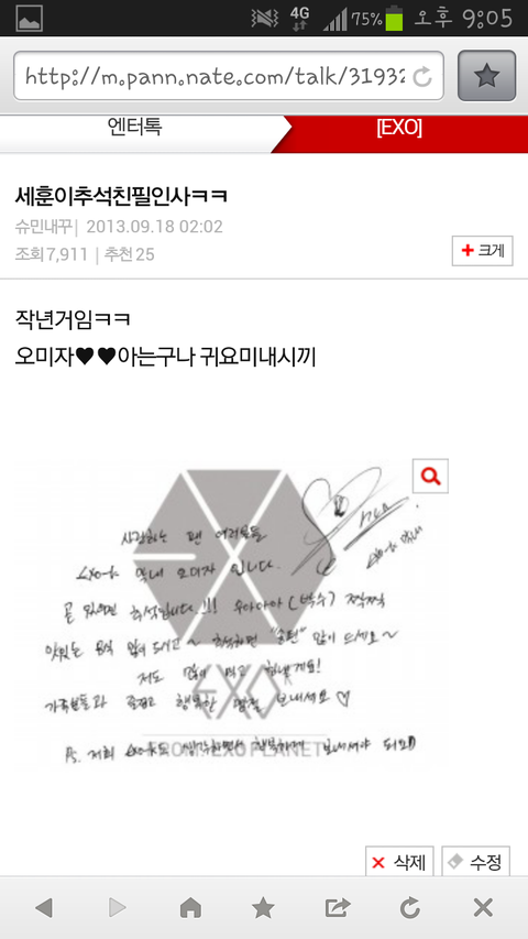 어젠가는 시우민글 2개 올라가서 지웠는데ㅋㅋㅋ