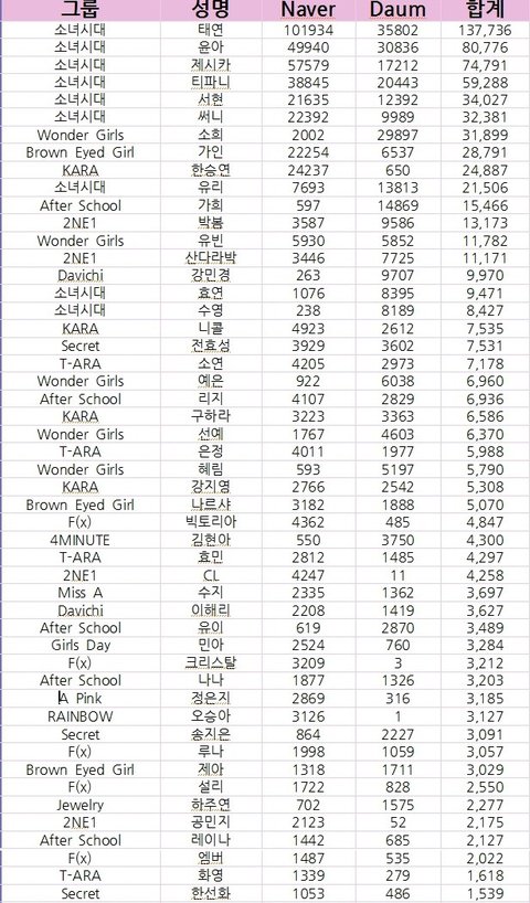여자아이돌 개인팬수 순위 ㄷㄷ!!