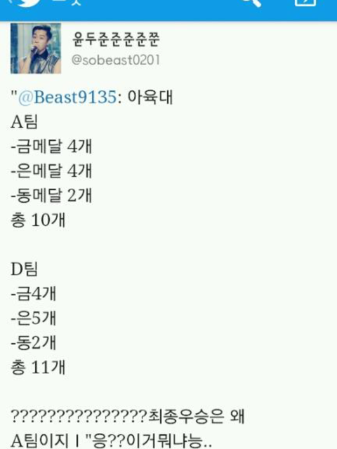 많은분들이 스포로 비스트와엠블랙 비투비.비에이피 포함된 D팀이 우승이라고 알고있었을텐데 어이없게 A팀에게 수상됨.