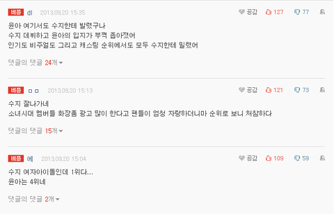 수지 팬들이 윤아한테 단댓글.