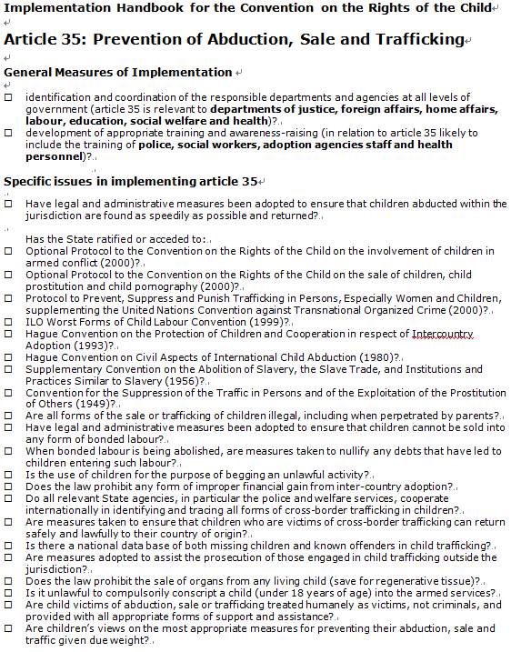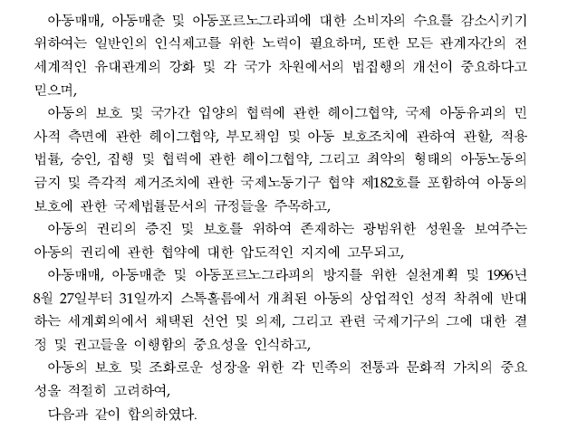 "아동인권보호를 위해서 각 국가들은 아래 내용을 엄숙히 준수하겠다." 는 말이다. "아동 매매/매춘/음란물 제작을 금지한다." 는 말이다.