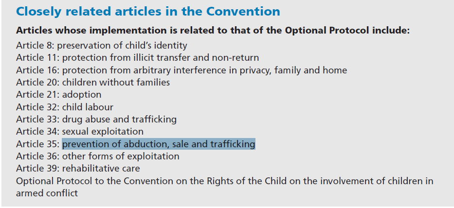 2조와 3조의 내용은 "아동을 이용하여 매매/매춘/음란물을 제작하는 행위는 절대 금지이며 어떤 경우에도 용납할 수 없다. 아동의 1. 성착취, 2. 장기밀매, 3. 강제노동 을 위하여 이루어지는 행위(아동의 수송, 문서위조 입양, 아동 포르노그라피의 유통)를 금지한다. 이는 자국 내/외에 거주하는 자국민과 자국 내에 거주하는 외국인에게도 동일하게 적용되어야 한다." 는 내용이다. 당연한 말을 어렵게도 적어놨다.