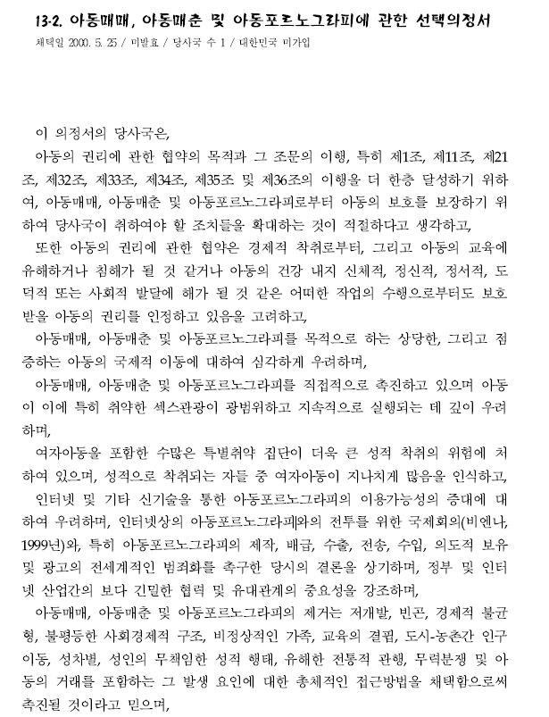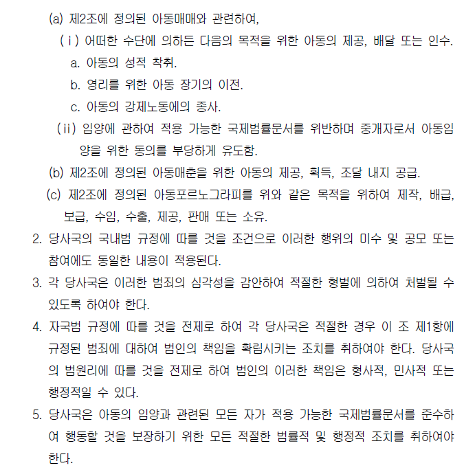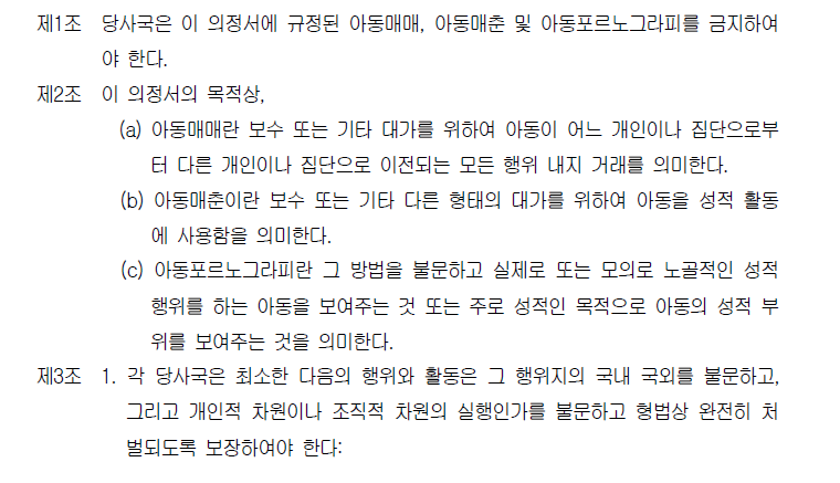 한국법 너무 허술하다. 2조(아동의 매매/매춘/포르노) 3조(국내 국외 불문) 못 지키고있다. 35조(아동의 유괴/매매/수송)도 취약하다. 제3자가 아동의 출생신고를 안할 수 있는데 그러면 관리 안된다. 그리고 범죄자가 한국인이거나 한국에 상주하는 외국인인 경우, 그리고 한국 아동이 외국에서 피해를 당한 경우에 대한 역외관할권을 확립하기 위한 법적 조치를 취해라.