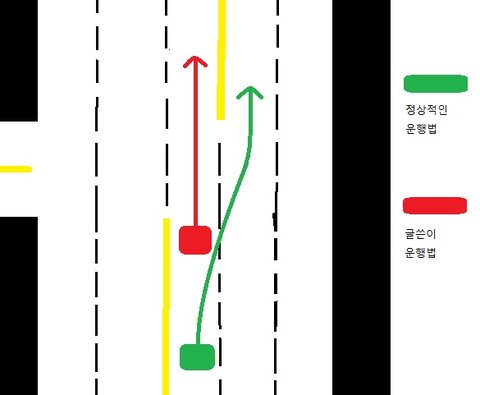 노란색 선이 중앙선인데 ㅋㅋㅋ 그 깔때기 같은걸로 중앙분리대가 형성되어서