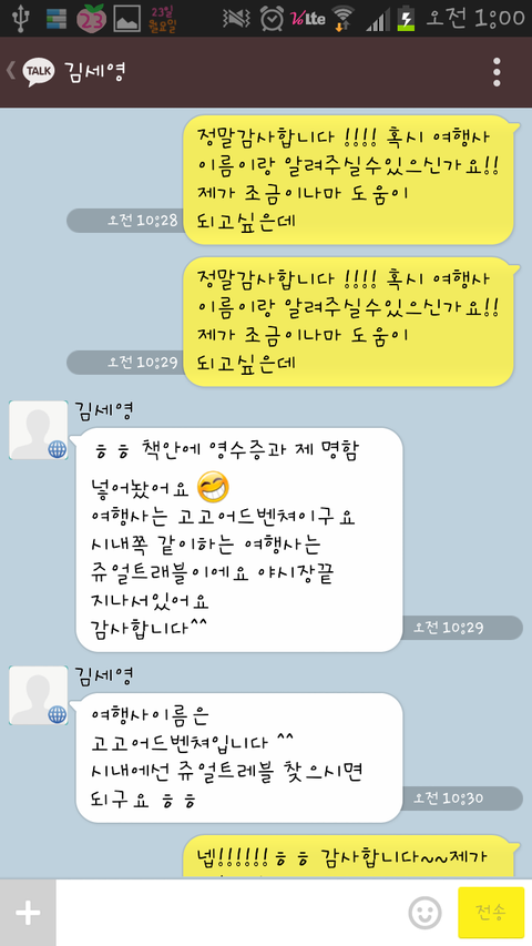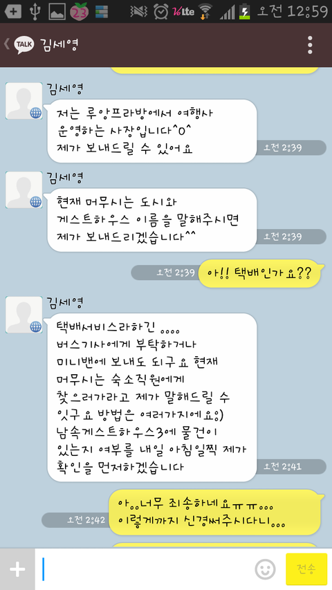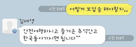 정말...저랑 친구랑 이 카톡을 보자마자 둘이서...와..진짜 눈물난다..라고 외치며.... 다행히 좋은분을 만나서 무사히 여행을 할 수 있겠다며 기뻐했습니다.
