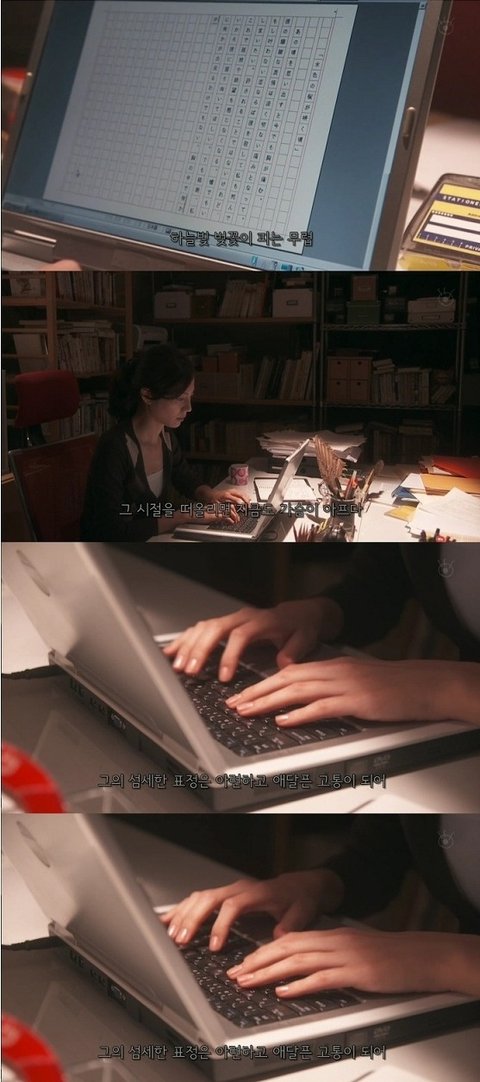 인터뷰가 끝나고 집에 돌아와 집필을 하는 여주. 글을 쓰기 시작하면 스스로 문장이 떠오른다는 여주의 말과 같이 글을 쓰는 여주의 손가락은 거침이 없음.