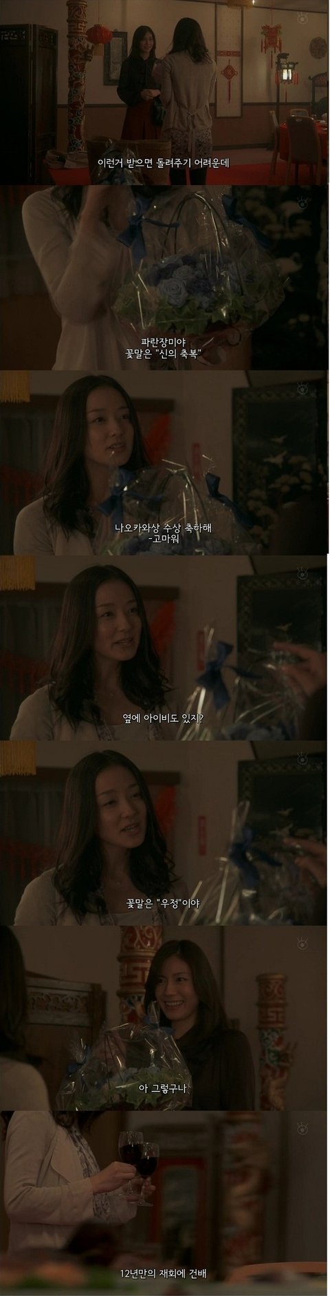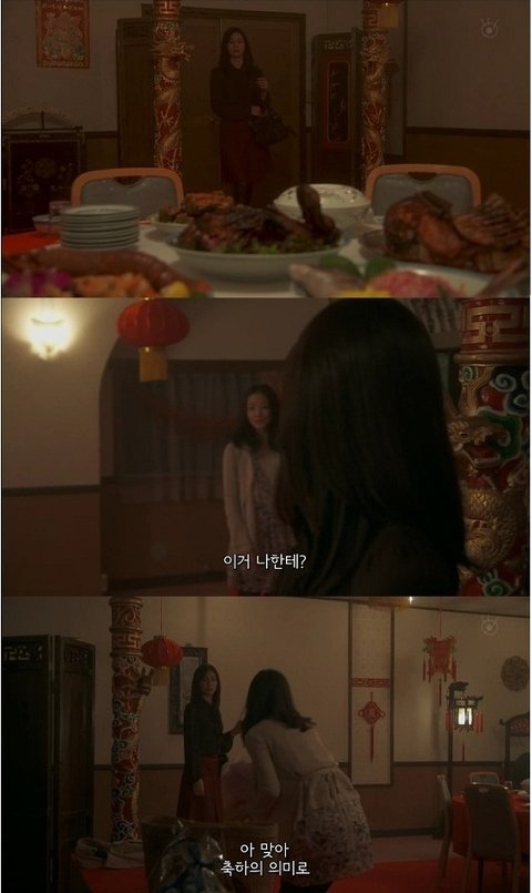 중국집 분위기가 물씬 풍기는 홀로 여주가 들어가자 동창이 선물이라며 뭔가를 건내줌.