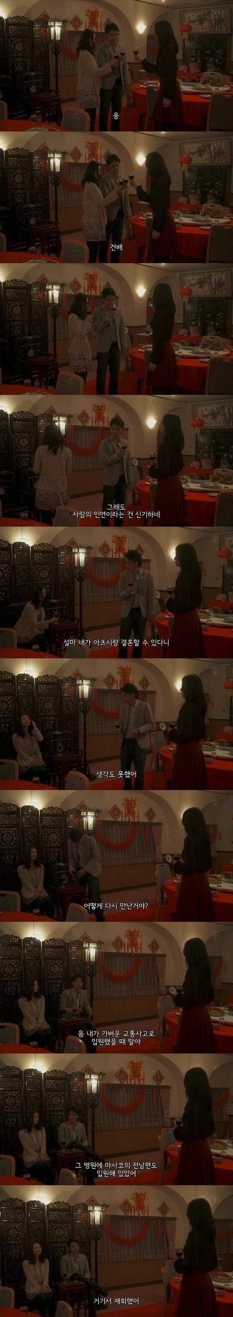 그 둘은 동창에 전남편(혼인신고 하자마자 뇌종양으로 사망했다던)이 병원에 입원했을때 거기서 처음 만났다함.