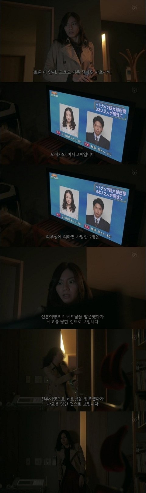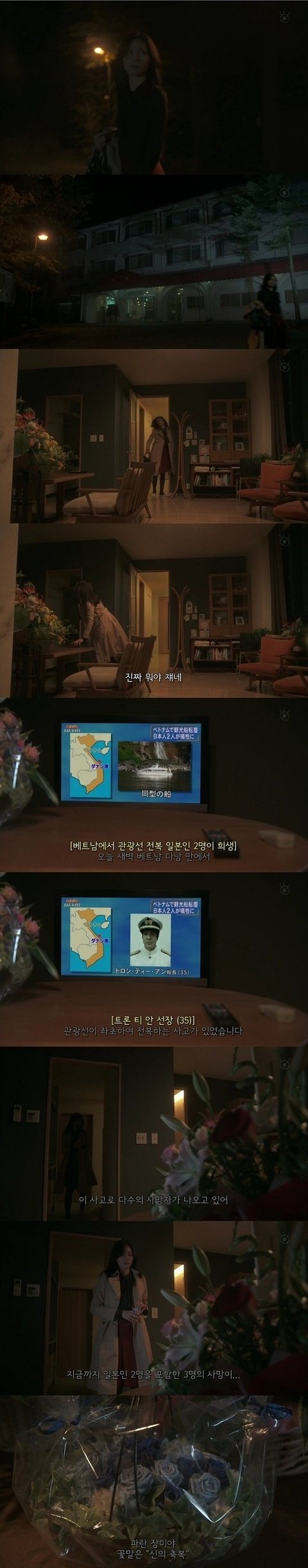 그 선장은 아까 여주를 안내해줬던 직원이었고, 곧이어 동창과 칸바루의 사진이 뉴스에 나옴. 그 뉴스의 내용은, 베트남행의 관광선이 좌초하여 전복하는 사고가 있었다는것.