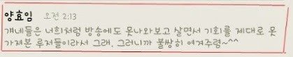 성지고인가 과기고 다니는 새끼가 카스에 쓴글이다 근데 양효임이라는 방송작가가 쓴글 보면 방송작가 수준 드러나드라...ㅋㅋㅋ 시발 ㅋㅋㅋ