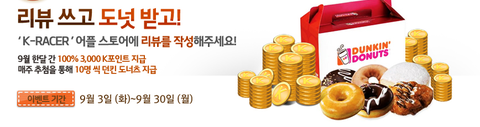 K-Racer 게임하고 어플 스토어에 리뷰를 작성하면 K포인트도 지급하고 도너츠도 준다네요 ㅎㅎ