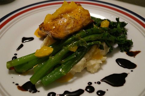 호주 마스터셰프에서 레시피를 따라한 연어스테이크에 오렌지 소스와 발사믹식초를 쪼린 발사믹 리덕션소스에 브로콜로니와 메쉬포테이토를 곁들여봤어요 ㅎㅎ
