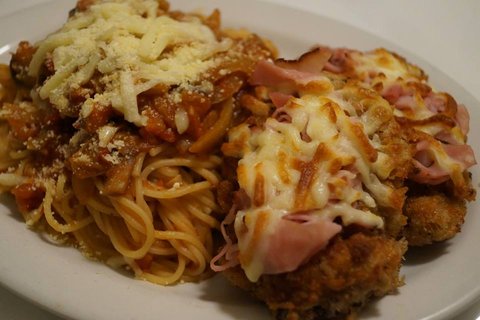 치킨파마자나라고 호주 국민음식이라고 할 수 있는데요. 치킨까스에 햄과 모짜랠라치즈를 올렸어요. 옆에 스파게티는 사이드로 만들어봤습니다.