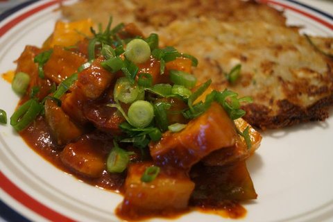 여기 현지 수퍼마켓에서 파는 삼겹부위는 매우 두꺼워요. 고추장 삼겹과 감자전입니다.