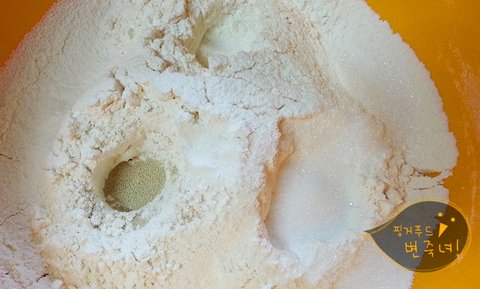 걸러진 부드러운 강력분에 구멍을 숑숑숑 손가락을 쑤셔 만들어주고