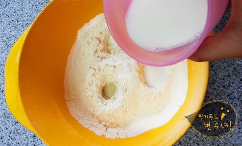 이스트/소금/설탕을 위의 분량대로 넣어주고 우유를 붜서
