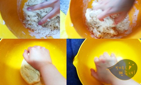 어깨탈골의 위험을 무릅쓰고 손으로 반죽시작.