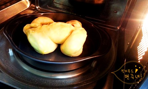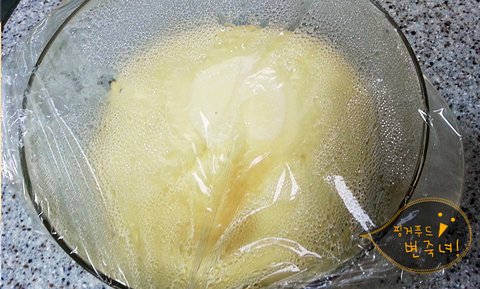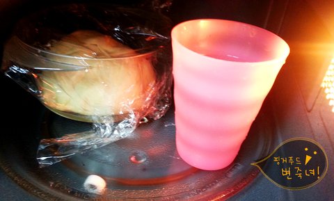 찰진반죽은 전자렌지에 뜨거운물과 함께 랩을 씌워서 한시간 이십분동안 발효를 합니다.