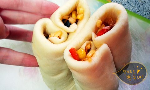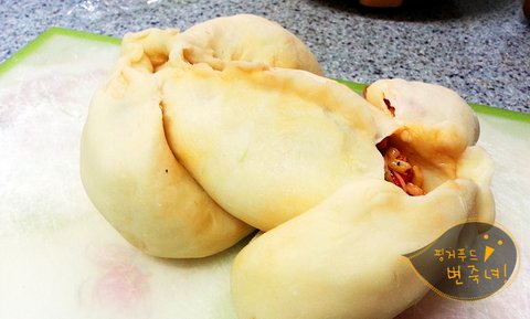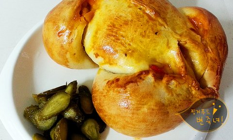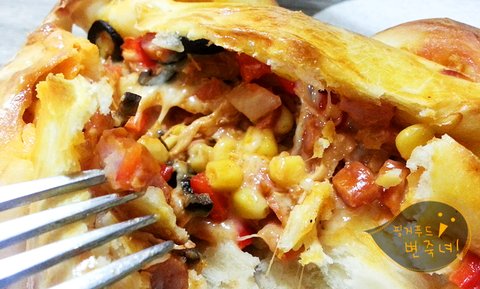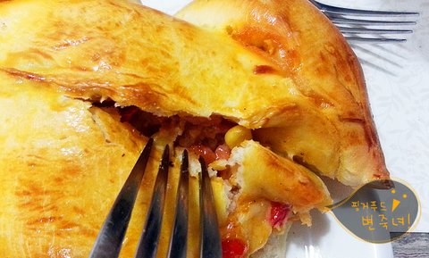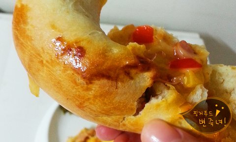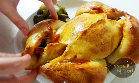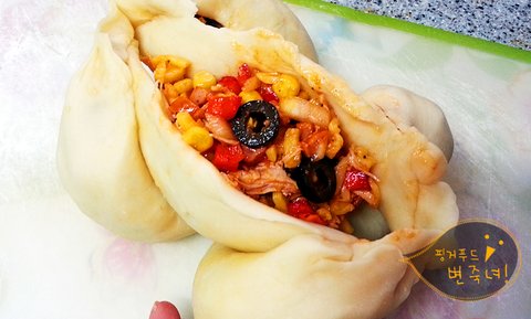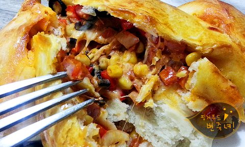 오오. 피자토핑이 흘러나오는 우리의 통닭빵이.헤헷.