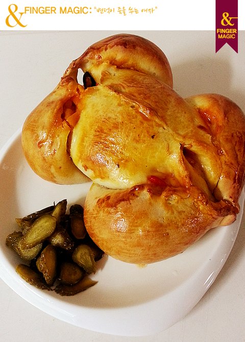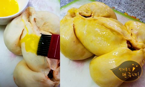 요렇게 만들어진 변죽녀의 통닭빵은 계란 노른자를 풀어 찹찹 칠해주고
