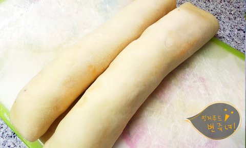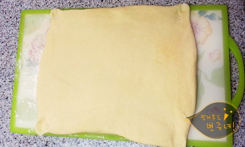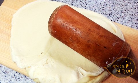반죽을 밀대로. 나는 깨방맹이로 밀어서 수건처럼 펼쳐줍니다.