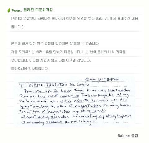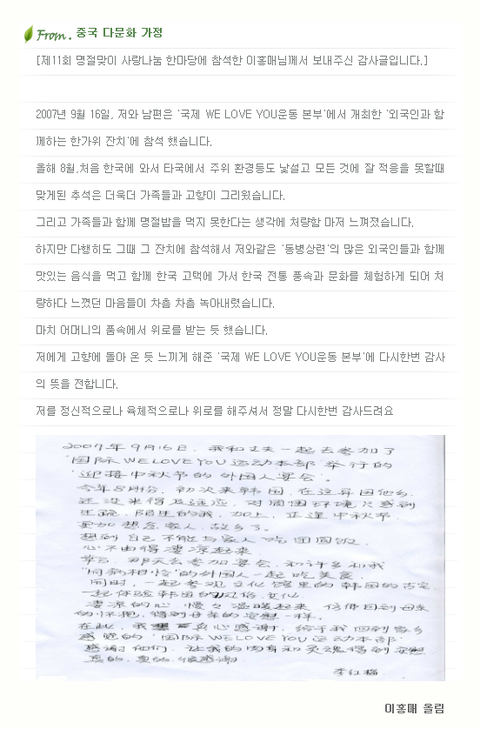 참석한 다문화가족 가운데 국제위러브유운동본부에 감사의 글을 보내와 올려 드립니다.
