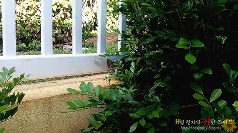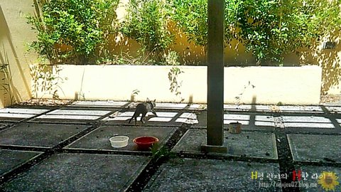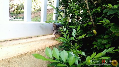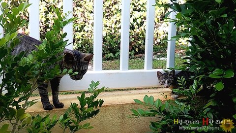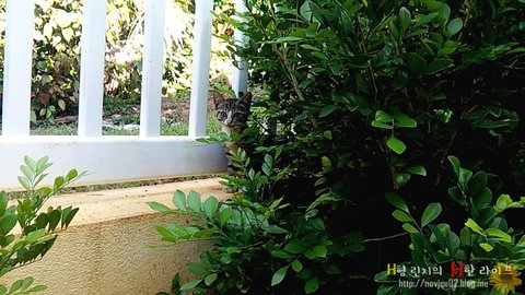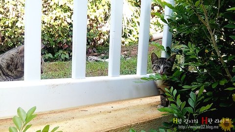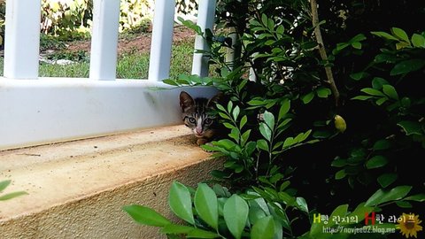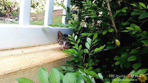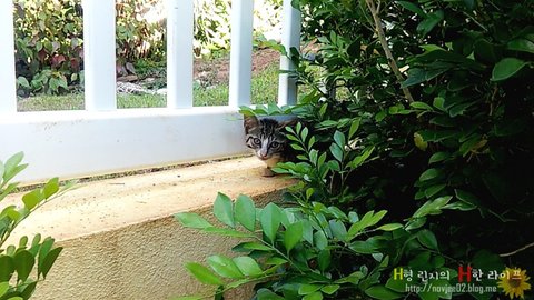 얘는 미니랑 키티에게 먹이 던져 주고 있으면 풀 숨에 숨어서 먀옹- 먀옹- 울어 대요.
