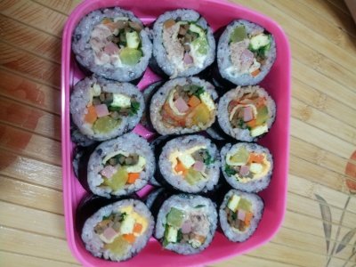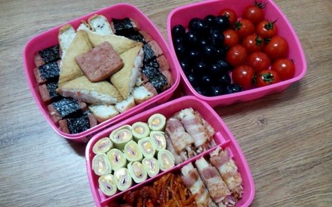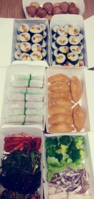 유부초밥 + 스팸초밥 + 베이컨버섯말이+치즈식빵말이 + 토메로 + 포도