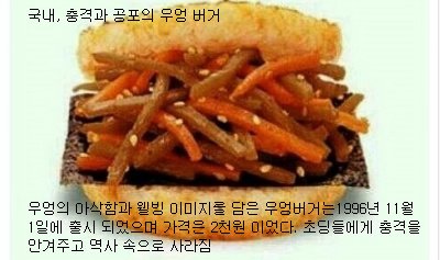 우엉버거에서 빵터짐ㅋㅋ 초딩들한테 충격주고 역사속으로 사라짐ㅋ 저렇게 만들거면 브로콜리버거, 가지버거, 당근버거, 오이버거, 도라지버거 무궁무진 하겠는데?