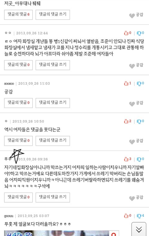 여자들이 남자보다 더 더럽고냄새날수밖에없다. 생식기구조상 이물질이 내부에 남을가능성이 더 크고 주기적으로 생리도 하기때문이지 그래서 여자들이 향수나 미스트 향기많이나는 제품을 선호하는거다. 그렇게 냄새가 남자보다많아서 신경쓰고 청결하게 다니려는 습관이 있지만 , 자신을 청결하게 하려다보니 주변 장소를 더럽히는게 습관이 된거지...
