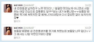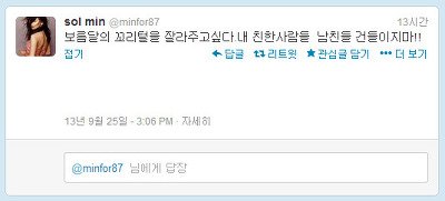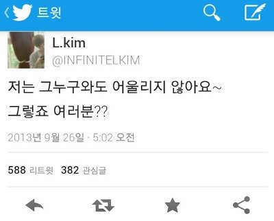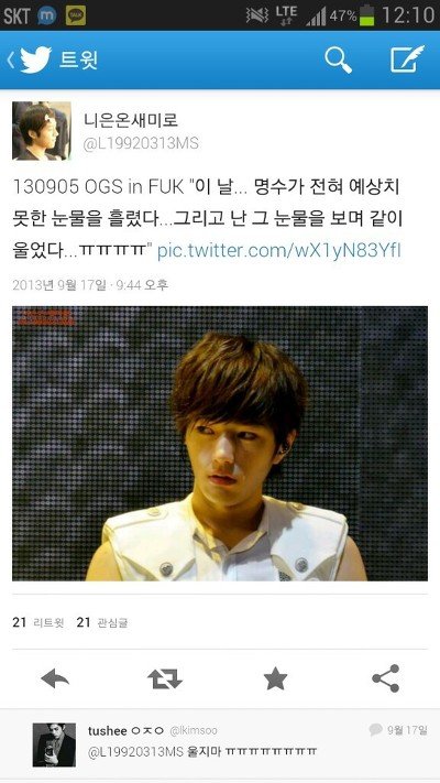 밑애댓글중에 사귀든지말든지 뭔상관이냐면서 댓글단 사람들 읶는데 팬들 입장에서 한번 생각해보셈 난 인슾은 아니지만ㅋ 공부는 치워두고 용돈받으면 그돈으로 선물사고 일부러 엘하고 소통하려고 트위터 해서 엘이 올리는 글마다 매번 설레고 팬들은 이래왔다는거지 ㅋ 근데 김명수는 팬들한테 그런게 아니고 여친한테 그런거 ㅋ 그래오 원래 팬들이 자기가좋아하는 연예인이 사귀면 축하해주고 응원해주는게 정상인데 이건 좀 축하해주기에는 여자도 뭐 까진 년인것 같고 트위터올린거보면 여자가 머리빈것같기도 하고 사람들도 이 여자 좋게 보지도 않고 트위터에 올린글들이 자기들이 아닌 여친한테올린 글이란걸 알게되서 실망하거나 떠나는거지 ㅌㅋㅋ 이런게 얼마나 배신감드는데 아다시 말하지만 난 인슾이 아님
