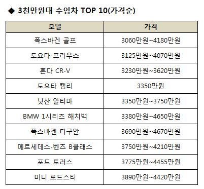 국내서 판매되고 있는 3천만원대 수입차 중 괜찮은 차량 TOP 10 이라고 합니다.