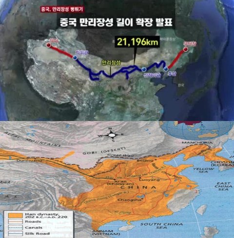 그러나 중국은 2009년, 고구려 유적인 박작성까지 만리장성이라고 주장해 길이를 2,500km 늘렸습니다. 이 사진들을 통해 중국이 왜곡 하고자 하는 우리나라 땅의 위치와 만리장성 길이가 이렇게 되면 옛 고구려와 발해까지 만리장성에 포함하게 된다는 것을 알 수 있습니다.