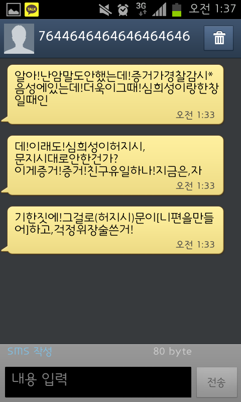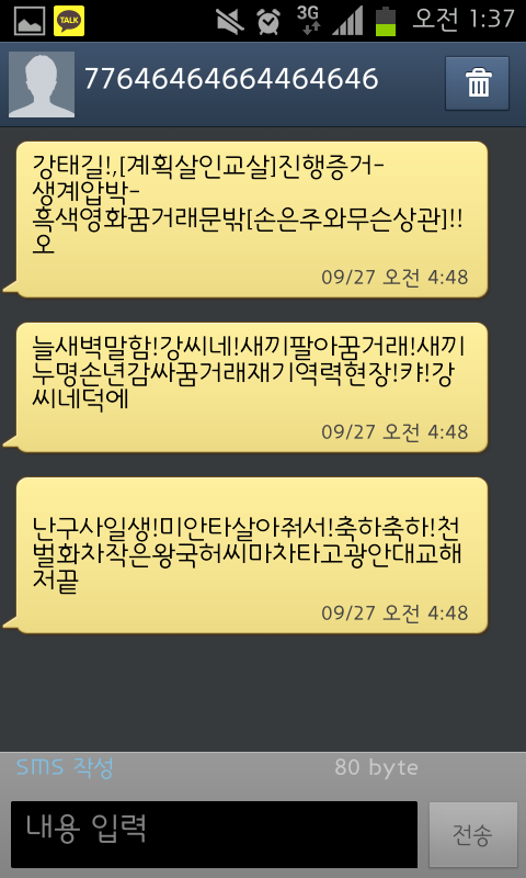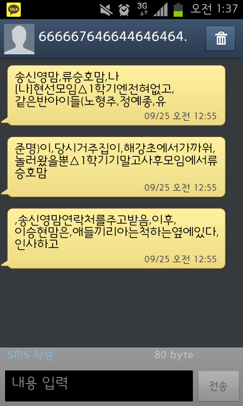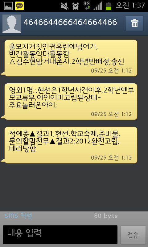 부산에 해강초등학교이라고 있어요 사교육비가 올라서 학교마다 교내에 교욱시설을 자비로 늘리고 있는 추세입니다 지금 그렇지 못한 학교는 알아서 폐교를 하고 있어요 어차피 교육비가 많이 들어가니까 그학교에 안보내려는 거죠 그러다 보니 자체교육시설이 좋은 학교로 보내려고 지금 학부모끼리 전쟁아닌 전쟁입니다 해강초등학교는 부산에서 그 중에 자체교육시설이 가장 우수한 학교입니다 일명 [사교육절감형 창의경영학교] 라네요 학부모들이 거기에 얘들을 넣으려고 촌지도 넣고 각자 조직(?)같이 형성을 해서 매일매일 간첩이 교신을 하듯이 문자를 하는겁니다 심지어 서로서로 단점이나 약점을 잡고 증거를 포착해서 그거 트집으로 학생의 전학이나 입학을 불가능하게 하는 일도 있습니다 윗글에 보시면 우리모자 인권유린에 넘어가 반간활동악마활동함 이거는 저쪽아줌마 조직들한테 약점을 잡혀 개고생했다는 내용이구요 김수현맘 거대촌지 2학년반배정 이거는 촌지를 아주많~이 줘서 2학년에 반배정이 확정된 상태라는 말이구요 송신영1학년사건이후2학년부모무교류이아긴이미고립상태 이건 1학년때 뭔 일이 있었나 보죠 ? 그후 부모와 학교 교류가 없어서 아이가 고립이 된상태라는 말 강태길 - 계획살인교살-진행증거-생계압박 이 뜻은 강태길이 학부모인지 학생인지는 모르겠지만 암튼 그집안에 그런 오점이 있어서 이 부분을 확보했다는 건지 그걸 미끼로 전,입학을 막아보려는 건지 그런 내용이구요 나머지는 저쪽아이들과 학부모들의 일거수 일투족을 일일이 같은 팀에게 보고한 내용이네요 학부모들도 무섭지만 해당학교도 부정부폐가 장난이 아니네요 만일 이 문자를 신고하시려면 본 해당학교의 부정입학등의 문제가 제기되고 공개화되면 관할경찰서에 제시할때 많은 증거와 도움이 되겠지만 지금은 이 문제가 기사화 되거나 하지는 않았네요 지금은 경찰서에 제시해도 다른 업무가 바쁘다는 핑계로 눈여겨 보지도 않을겁니다 혹시 아는 공무원이 있으면 이야기 하고 상의해보세요 그분에게는 커다란 한(껀)이 될수도 있으니까요 이미 발설됬구나 -_-;; 문자가 계속오는 이유는 그전에 번호를 학부모중 한사람이 썼던거거나 아니면 그 사람이 번호를 잘못알고 단체문자를 보낸거내요 자기일원인줄 알고 번호확인 어플이나 지정차단 음소거해서 고통을 어떻해 해결하세요 -.-;; 간첩이나 조선족문자는 아니니까 겁내하지 않아도 될듯 해독하느라 피곤하네 ...배도 고프고 ....