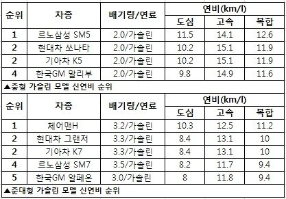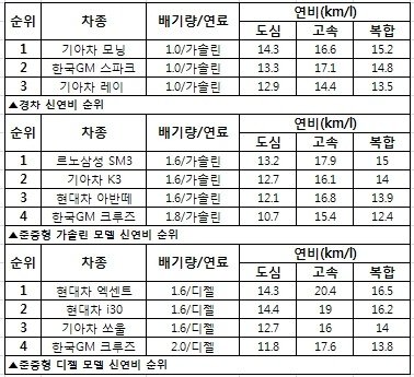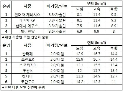신연비 기준 국산차 순위입니다.