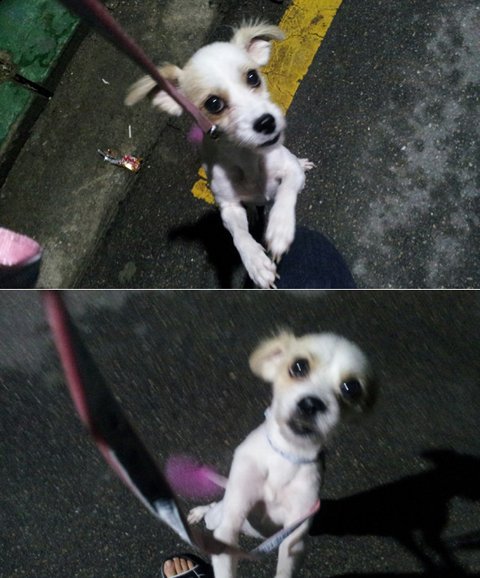 <주말동안 내내 비온후 소강상태를 보이던 어젯밤 산책나갔는데 너무 좋아서 걷지도 않고 엄마랑 눈 맞추고 매달리기 바쁜 쁜이>