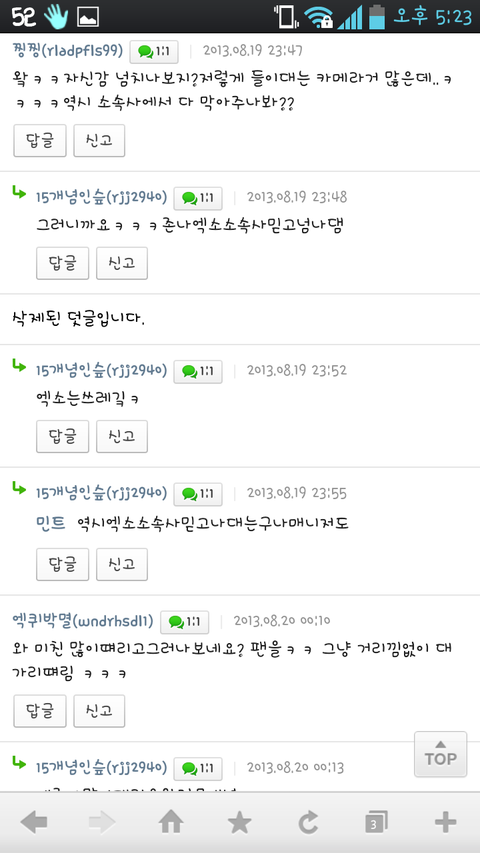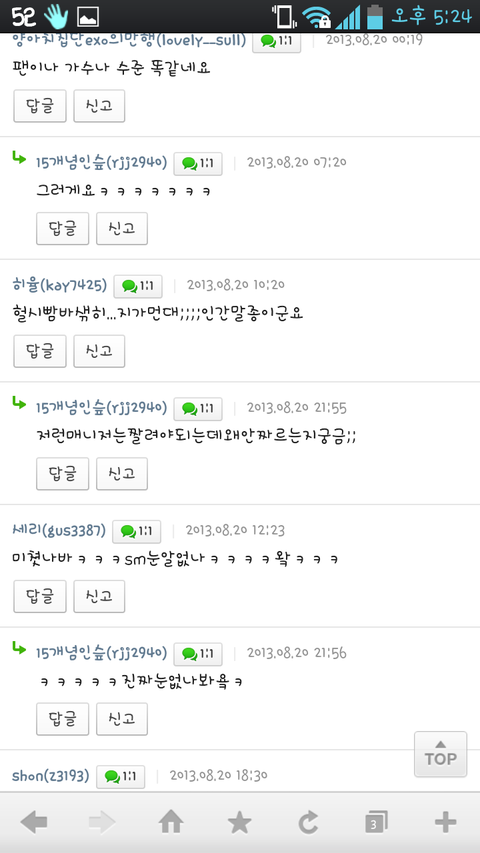 엑소매니저라고치고카페에글올라온게잇길래 오홍 하고들가서봣는데댓글이이따구인거임ㅋㅋㅋㅋㅋㅋ 짜증나서 가입해가지고 또무슨똥글이잇나하고 볼려고 가입하기눌럿는데