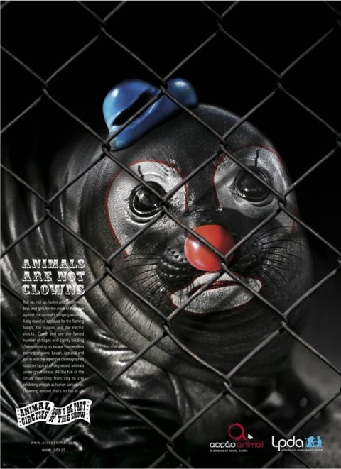 철창 속 광대 분장을 한 물개의 표정이 정말 슬퍼보이는데요.