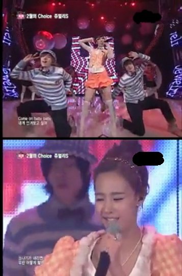 ↑모두가 경악했던 하루종일 의상. 검은비닐옷과 3D안경 그리고 과학실험룩... 말 그대로 실험적인 코디였으나 아직도 제아 최악의 의상 탑3에 들고 있다.