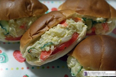 감자으깨서 야채넣고 마요네즈+머스타트 샐러드에 버무려서 버터롤 빵에 넣어줬답니다.
