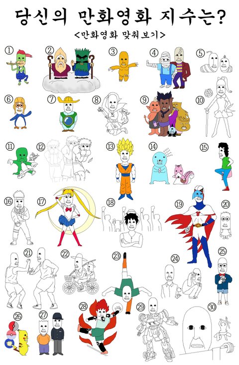 1. 개구리 왕눈이 2. 배추도사 무도사 3. 디지몬 어드벤처 (아구아구 아구몬!) 4. 두치와 뿌꾸 (멍청한 프랑켄) 5. 라바 6. 뽀로로 7. 꾸러기 수비대 (울보 돼지띠년) 8. 카드캡터 체리 (카드 도박년) 9. 꼬비꼬비 (도깨비새끼..) 10. 천사소녀 네티 (도둑년) 11. 아기공룡 둘리 (깡패) 12. 더 파이팅 13. 드래곤볼 14. 보노보노 15. 달려라 하니 16. 나루토 17. 세일러문 18. 원피스 19. 독수리 오형제 20. 슈퍼배드(슈퍼배드에 나오는 미니언) 21. 슬램덩크 22. 짱구는 못말려 (아버지 회상편) 23. 축구왕 슛돌이 (독수리슛 포즈) 24. 데스노트 (라이트와 L) 25. 명탐정 코난 26. 포켓몬스터 (피카배구 장면) 27. 검정고무신 28. 피구왕 통키 29. 다간? K캅스? 트랜스 포머? (로봇 만화 경찰차같은데... 가슴팍에 별보니 다간같기도 하고...) 30. 진격의 거인 우리 세대네요 만화가.. 전부다 알겠음...