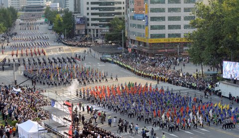 군대를 다녀오신 분들이라면 훈련 중에 가장 하기 싫은 훈련이 제식훈련임을 기억하실 겁니다. 그 기억을 더듬으며 한 번 생각해보세요. 신병도 아니고 실무에서 근무 중인 군인들이 7월 15일 경에 소집되어 10월 1일 행사를 마칠 때까지 무려 80일 가까이를 하루 8시간 행진을 위한 제식훈련만 내리 한다는 것...그런 고생의 결과를 내보이는 것은 단 하루입니다. 행사 당일 대통령 앞에서 하는 열병과 분열, 그리고 시가행진 서너 시간… 이걸 마치고 부대로 돌아가면 포상휴가 열흘이 있었습니다. 오늘 저는 1970년대 제가 겪었던 고생들을 했을 군인들을 보았습니다.