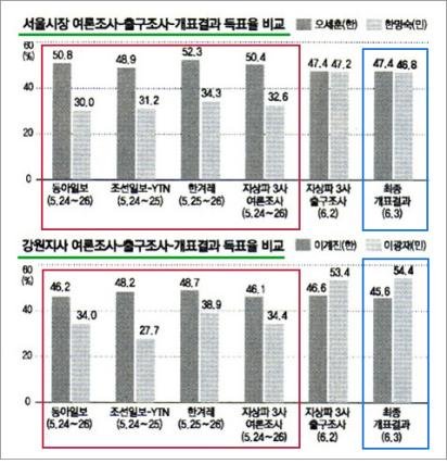 (1) 여론조사에 세뇌되다 - 한나라당은 여론조사기관을 최대한 활용하여 오세훈 대 한명숙의 대결에서 커다란 차이로 오세훈이 압승할 것이라며 지속적으로 분위기를 띄웠고, 그것은 모든 사람들로 하여금 거의 ‘세뇌’수준으로 ‘한명숙은 큰 차이로 질 것’이라는 인식을 갖도록 하기에 충분하였습니다. 하지만 결과는 완전히 다르게 나타났습니다. 오죽하면 선거결과를 분석한 김호기 교수는 다음과 같이 말합니다.