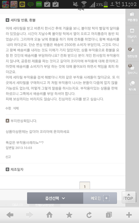 그래서 어제 쇼핑몰측에 문의 글을 올렸는데, 답변이 왔더라구요.