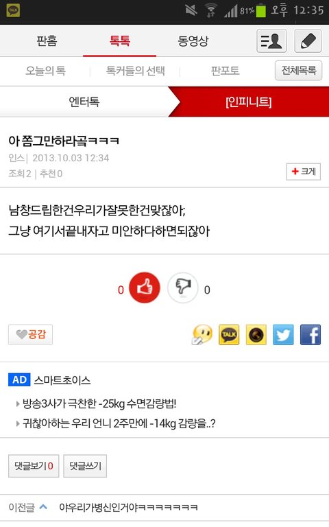 진짜 너내는 답이없다 아까 어떤 한분이 엓판에 와서 정식으로 사과한다고 해서 진짜 싸우지 안을려고 하는데 또 어떤분이 또 이상한글을 쳐 올리셨넼ㅋㅋㅋㅋㅋㅋ